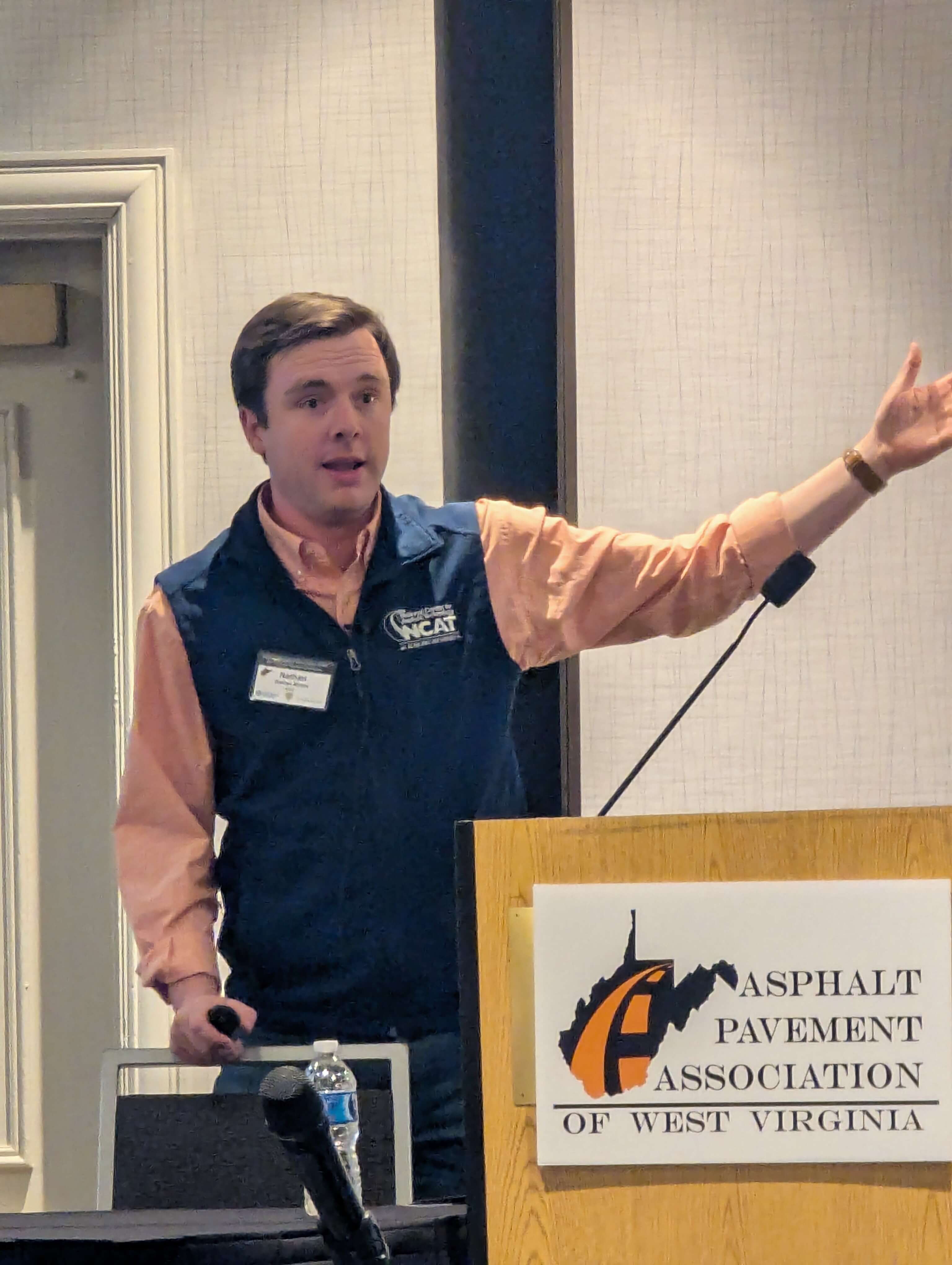 Following a brief break, Nathan Moore, assistant director for test track research at NCAT, presented an overview of the WVDOH section that was placed on the track during its 2024 reconstruction. The section examines a thin lift asphalt overlay with calcined bauxite, the same aggregate used in high friction surface treatments (HFST). In addition, Moore talked about the use of the SDX Screed Plate from Caterpillar regarding the goals of added mechanical texture to help friction. The Pat Parsons Asphalt Faculty Fellow at WVU, Dr. James Bryce followed, discussing asphalt and pavement research at the university. Rounding out the day, Shawn Jack, asphalt group supervisor for the WVDOH presented on the bond strength specification and the field investigation conducted to determine if failed bond strength testing lead to premature pavement failures. Given no evidence of the claim, Shawn informed the audience that the WVDOH would be moving away from the penalty structure associated with the bond strength testing.